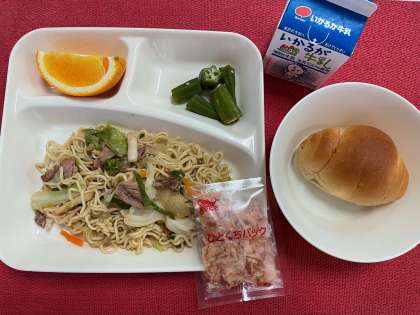 今日の献立は、『和風焼きそば・オクラの甘酢あえ・オレンジ・黒糖パン・牛乳』でした。