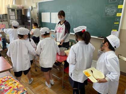 和風焼きそばは、豚肉、いかを主材に使用したしょうゆ味の焼きそばです。食べる時にかつおぶしをかけます。3色食品群を学んだ2年生の返却の様子を見ていると、しっかり食べることができていました。