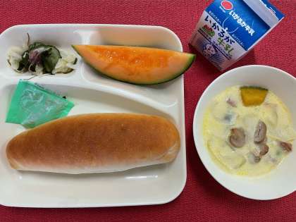 今日の献立は、『かぼちゃのクリームシチュー・ミックス海そうのサラダ・クインシーメロン・コッペパン・りんごジャム・牛乳』でした。
