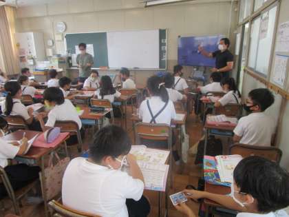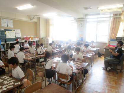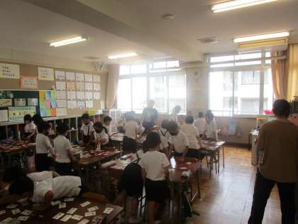 2年生は「ひらがな・カタカナ」のカルタをしていました。子どもたちは札を取ろうと一生懸命でした。5年生はCーNETの先生と一緒に外国語の学習に取り組んでいました。今日は「1月」など「月」を英語で発音する活動をカードを使ってゲームの要素を取り入れて学習していました。