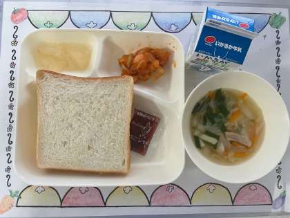 今日の献立は、『えびのチリソース・中華スープ・和なし(カット缶)・食パン・いちごジャム・牛乳』でした。
