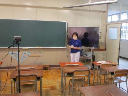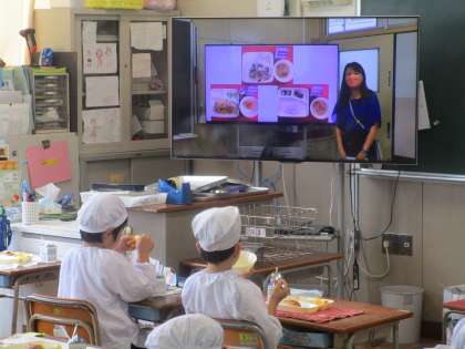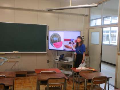 月初めなので、栄養教諭から7月の給食献立のお話がありました。夏が旬の食材がたくさんでます。スイカが紹介されたときは、子どもたちは大喜びでした。