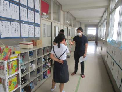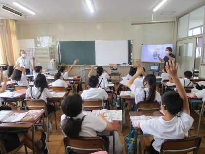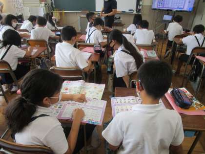 5・6年生は外国語の学習に取り組んでいました。5年生はゲームを交えてSUNDAYなど曜日を英語で話していました。6年生はC−NETの先生と一緒に会話を行うテストを行っていました。6年生児童は素晴らしい発音で会話していました。びっくりしました!