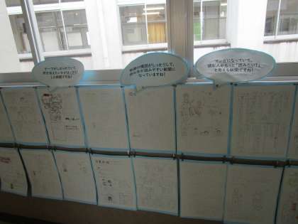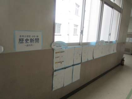 6年生の教室前には、今までの学習をまとめた歴史新聞が掲示されています。工夫できているポイントを先生が示しているので、次回の作成に生かすことができます。