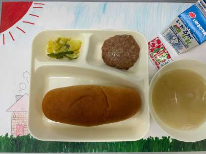 今日の献立は、『焼きハンバーグ・豆乳スープ・キャベツとピーマンのカレーソテー・黒糖パン・牛乳』でした。