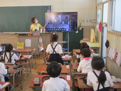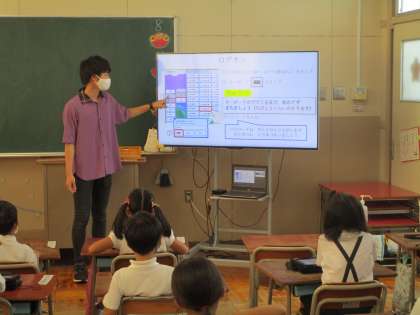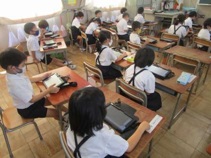 1年生は学習者用端末を使い、チームスにつなぐ練習を行いました。1年生ですので、担任の先生がモニター画面で図などを使いながら丁寧に説明をしています。子どもたちも興味をもって使い方を学習していました。感染症対策で1年生であっても学習者用端末を使う機会があるかもしれません。大切な学習の機会となっています。
