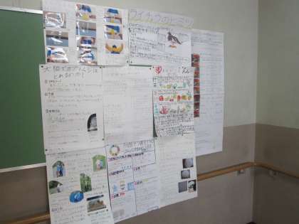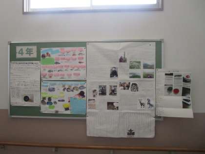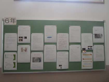 4・5・6年生の掲示板に紹介されている作品です。高学年になると、テーマに選んでいる題材にも感心させられます。6年生は学習者用端末を使い、ワードやパワーポイントのソフトを使い、研究レポートをまとめていました。まとめ方を見ていると、子どもたちのスキルに驚きました。これからの時代の流れを感じます。