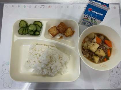 今日の献立は、『肉じゃが・あつあげのみそだれかけ・あっさりきゅうり・米飯・牛乳』でした。