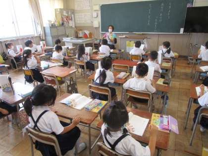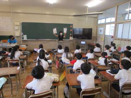 1年生の教室では、保健指導と国語の学習が行われていました。保健指導は養護教諭が行います。感染症、熱中症、ケガの予防について学習しました。その後、保健室で発育測定を行いました。