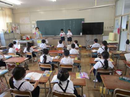 国語の学習では役割分担し、動作を交えた音読を行っていました。とてもはきはきと体を動かし読むことができていました。