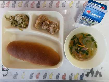 今日の献立は、『鶏肉のからあげ・とうがんの中華スープ・切干だいこんのごま辛みづけ・黒糖パン・牛乳』でした。
