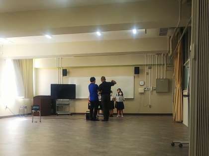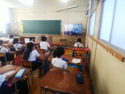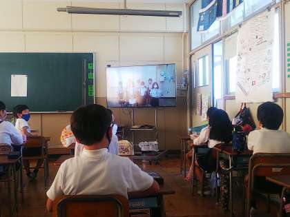 3年生は、自分たちで調べた商店街のお店の見どころを、多目的室のカメラを通して発表し、各クラスのTVでオンラインで静かに聴いて学習していました。