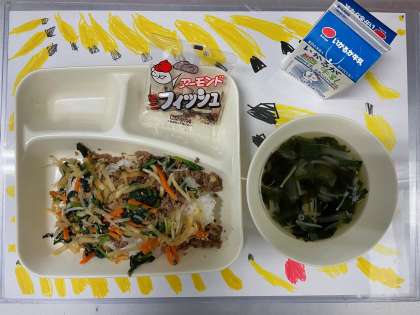 今日の献立は、『ビビンバ・わかめスープ・アーモンドフィッシュ・牛乳』でした。