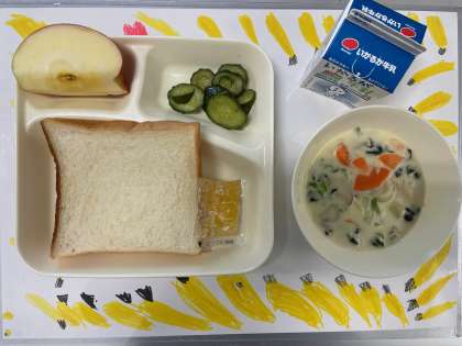 今日の献立は、『きのこのクリームシチュー・きゅうりのバジル風味サラダ・りんご・食パン・マーマレード・牛乳』でした。