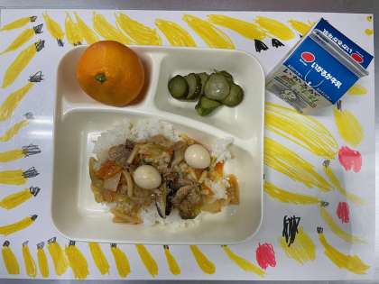 今日の献立は、『中華丼・きゅうりの中華あえ・みかん・牛乳』でした。