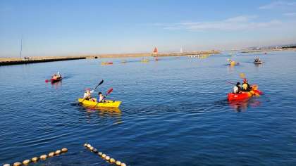 2組のみんなもペアで息を合わせてスピードがぐんぐん上がる漕ぎっぷりです。あっと大阪湾に出ていきました。
