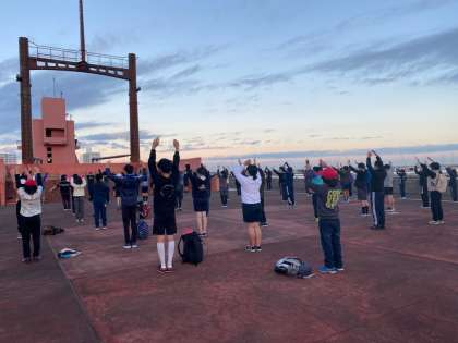 子どもたちは、みんな元気です。少し眠いそうな顔をしていますが、ただいま朝の集いでラジオ体操をしています。