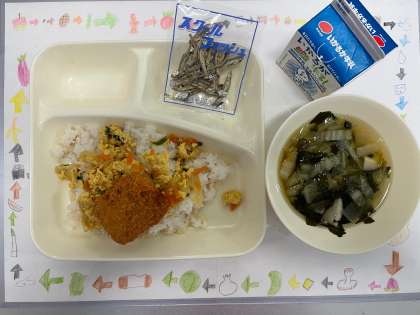 今日の献立は、『かつ丼・すまし汁・ミニフィッシュ・牛乳』でした。