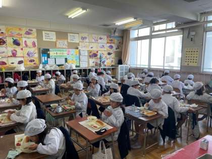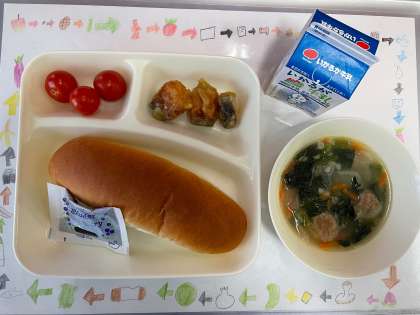今日の献立は、『さけのマリネ・肉だんごと麦のスープ・プチトマト・コッペパン・ブルーベリージャム・牛乳』でした。