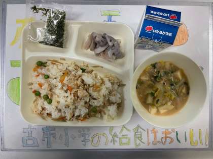今日の献立は、『鶏ごぼうご飯・みそ汁・焼きれんこん・牛乳』でした。