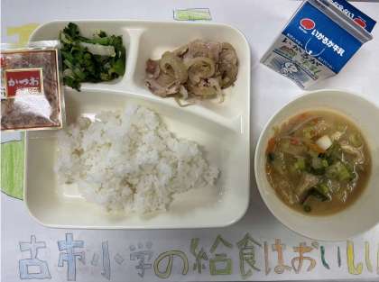 今日の献立は、『豚肉のしょうが焼き・さつまいものみそ汁・なのはなのおひたし・米飯・牛乳』でした。
