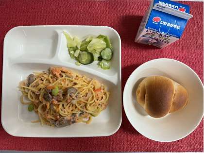 今日の献立は、『さけのクリームスパゲッティ・キャベツときゅうりのサラダ・黒糖パン・牛乳』でした。