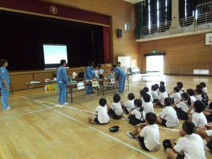 3時間目は、講堂でゲームをしたり「ごみ」に関するお話を聞きました。