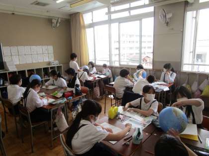 5年生は社会科の学習に取り組んでいました。地球儀の特徴を調べていました。
