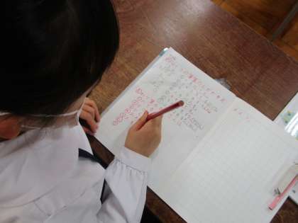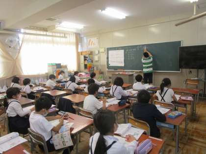 4年生の学習の様子です。算数科で割り算のひっ算の仕方について学習していました。初めて割り算のひっ算を学習します。とても大切な学習でした。ノートにしっかり計算の仕方をまとめていました。