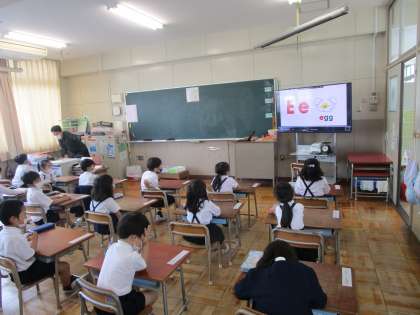 1年生の様子です。朝の会の時間帯に外国語のモジュール学習に取り組んでいました。音楽に合わせてアルファベットの発音を学習していました。