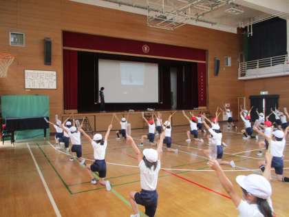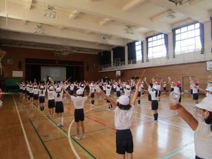4年生の様子です。体育館で運動会の練習に取り組んでいました。4年生は本番ではパーランクーを使います。今はペットボトルを使っていますが、本番に向けて練習を重ねていきます。
