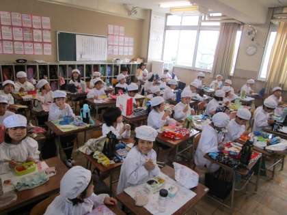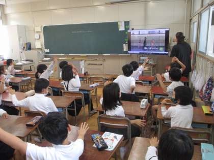 今日の低学年の遠足は雨天延期となりました。2年生の子どもたちは教室で学習に取り組んでいました。1組では運動会で行うダンス動画を見ながらこれからの練習に備えていました。2組では図画工作科の学習でパスを使って作品をつくっていました。