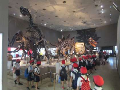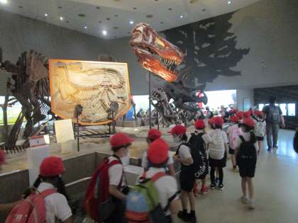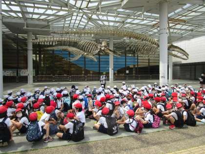 長居公園に到着後は、植物園内にあります自然史博物館の見学を行いました。正面に大きなクジラの骨格が展示してあり、子どもたちは驚いていました。館内には様々な展示物がありますが、恐竜の骨格の展示に子どもたちは大喜びでした。