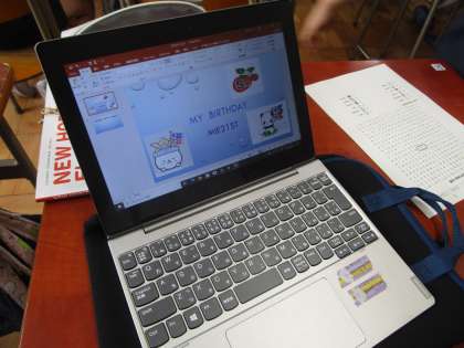 子どもたちは楽しんでパワーポイントを使ってこのような画面を作り始めています。完成が楽しみです。