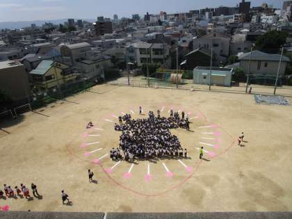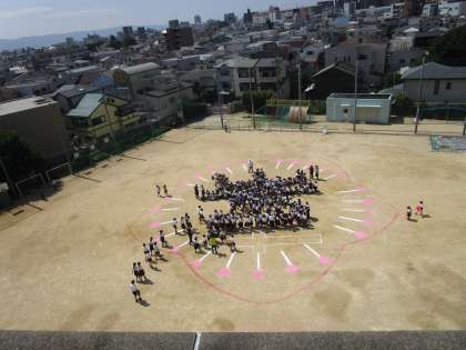 昨日お伝えしましたように、本日は100周年記念行事としてドローンによる航空写真撮影を行いました。運動場に子どもたちが色画用紙をもって、校章を描きました。ドローン操作の専門家の方々にお越しいただき、撮影していただきました。