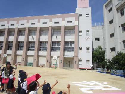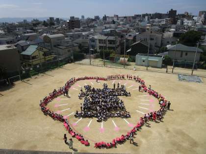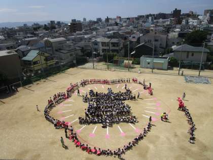 このように子どもたちが色画用紙を持って下書きの印に立ちます。少しずつ校章の形ができていく様子がわかります。撮影する場面では、色画用紙を頭の上にあげていました。