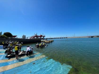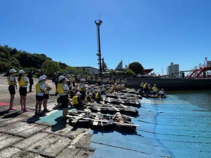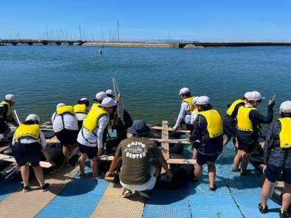 最初のプログラムはいかだです。タイヤチューブと板をロープで繋いだいかだをパドルを使って進めます。