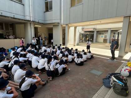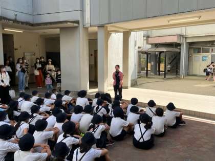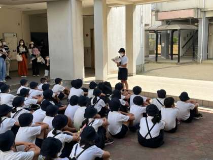 帰校式を中庭で行いました。看護師さん、児童代表のあいさつがありました。