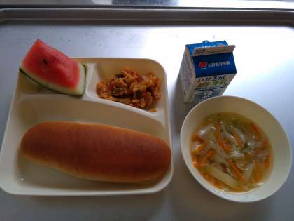 今日の献立は「パエリア、ウインナーとキャベツのスープ、すいか、黒糖パン、牛乳」でした。