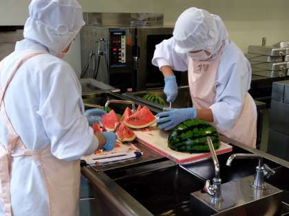 すいかは1年に1回だけ給食に登場します。1玉を64個に切り分けました。