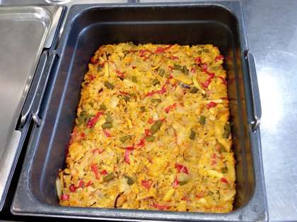 パエリアは、スペインの代表的な料理です。赤ピーマン、さんどまめ、カレー粉で彩りよく仕上がりました。