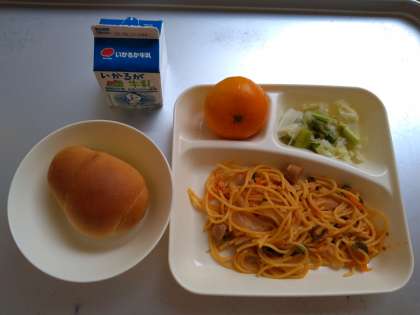 今日の献立は、「チキントマトスパゲッティ、グリーンアスパラガスとキャベツのサラダ、みかん(冷凍)、1/2黒糖パン、牛乳」でした。