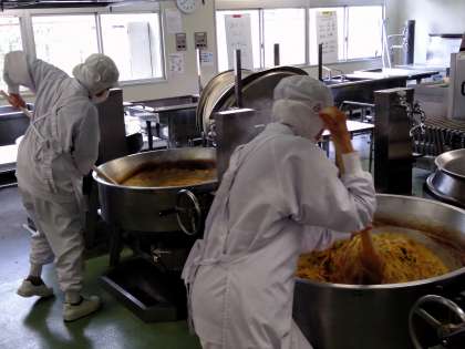 給食調理員さんは、スパゲッティにしっかり火が通るように、体を使って何回も何回も混ぜてくれていました。