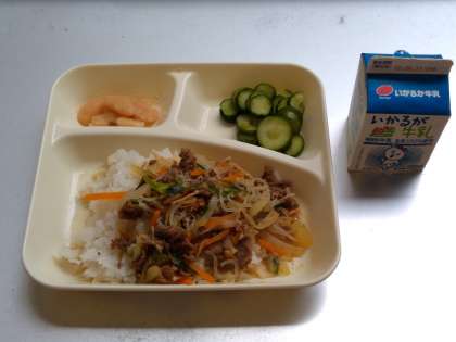 今日の献立は、「牛丼、きゅうりのしょうがづけ、大福豆の煮もの、牛乳」でした。