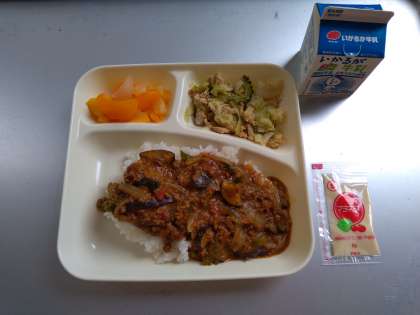 今日の献立「夏野菜のキーマカレーライス、ゴーヤとツナのマヨネーズ風味、ミックスフルーツ(缶)、牛乳」は、令和3年度学校給食献立コンクール優秀賞に選ばれた献立です。献立のねらいは、「夏野菜をたくさん食べることで、夏バテ予防になると考えました。」です。