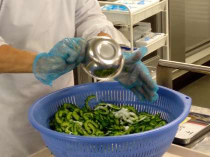 大阪市の給食では、ゴーヤの苦みを塩で下味をつけてやわらげます。