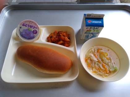 今日の献立は、「かぼちゃのミートグラタン、スープ、ぶどうゼリー、黒糖パン、牛乳」でした。