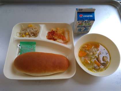 今日の献立は、「鶏肉とてぼ豆のスープ煮、じゃがいもとトマトのチーズ焼き、もやしとコーンのソテー、コッペパン、りんごジャム、牛乳」でした。