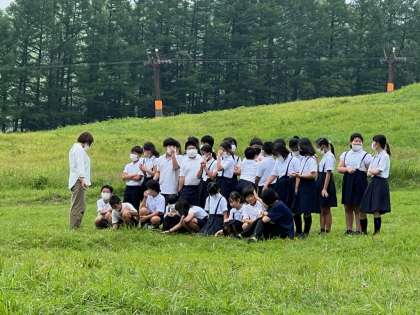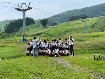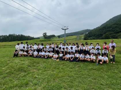ただいま、ハチ高原やまとよに到着しました!バスから降りて集合写真を撮影しました!