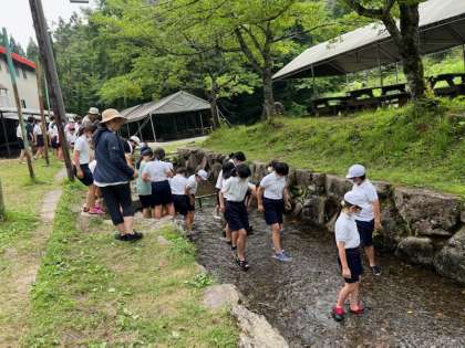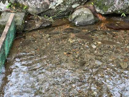 いよいよ、魚つかみです。インストラクターさんからの諸注意を聞いて、いざ小川に乗り込みます。川の水はとっても冷たいです。